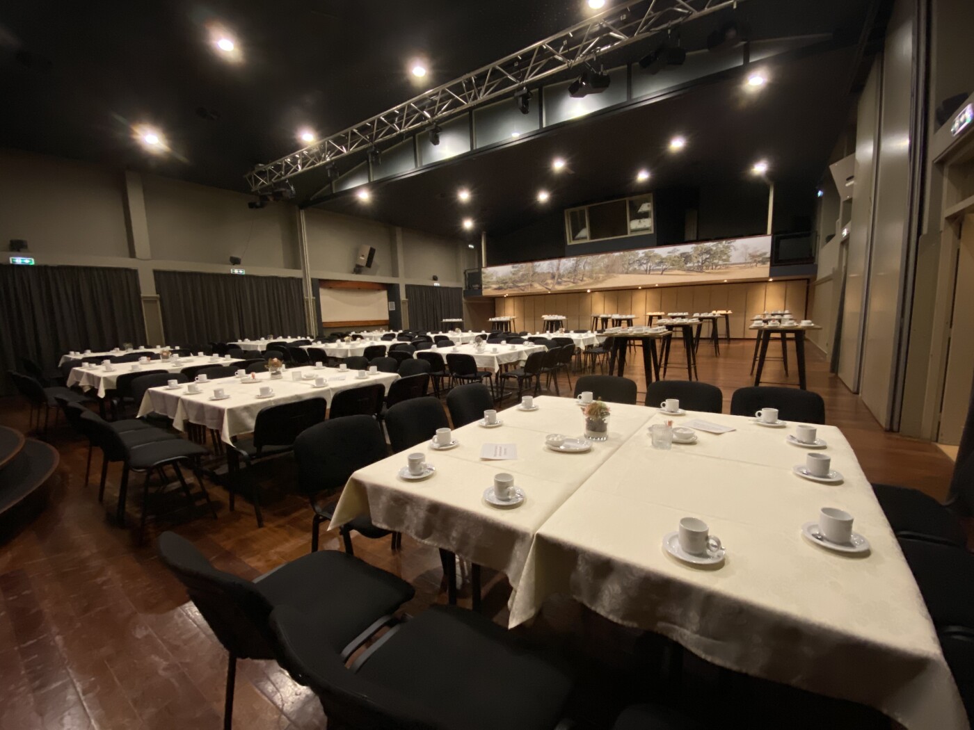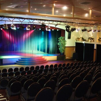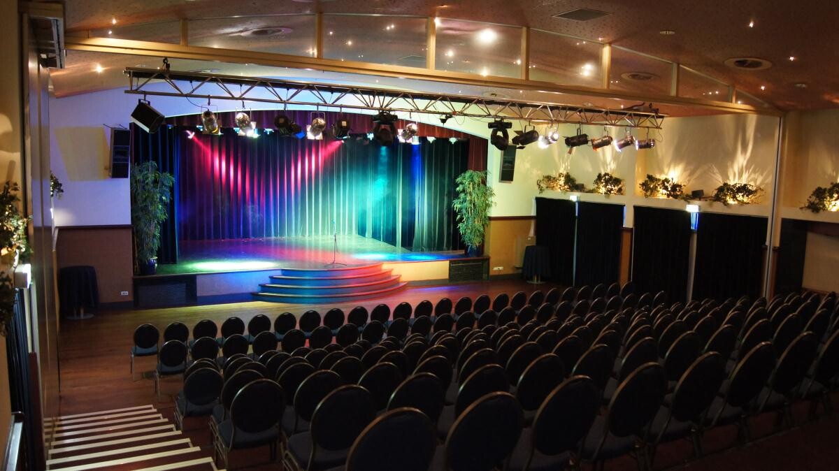 Daarnaast kan de zaal worden ingericht als kleine schouwburg door het uitrijden van een tribune. In deze opstelling kunnen circa 250 bezoekers trapsgewijs deelnemen aan een seminar, lezing of voorstelling. Een vast podium met een basisvoorziening aan theatertechniek is hierbij standaard aanwezig.